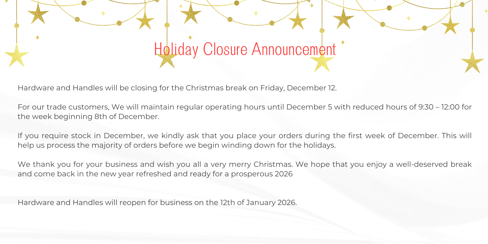 The goods being exchanged must be returned to Hardware & Handles NZ Ltd in the original, unopened condition.